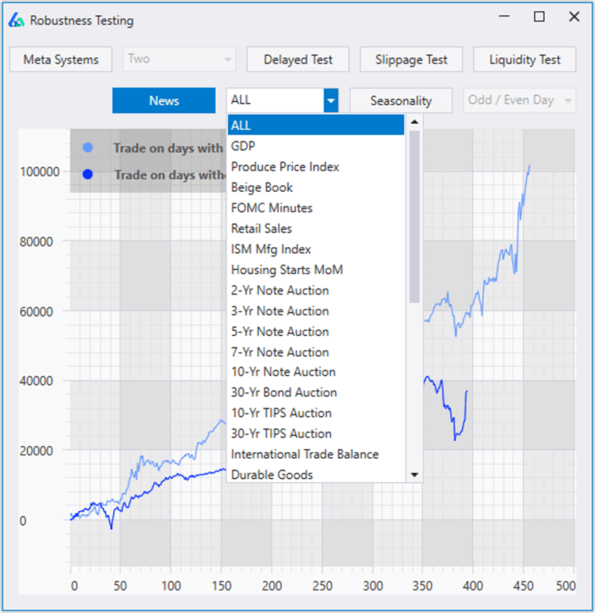 To see how a strategy performs during different news events, select a strategy in the Results Window and open the Robustness Testing display. In this display, please select the News tab. This will show how your strategy does on days with and without each news event. This data can be used to add filters or investigate unnoticed trading edges.