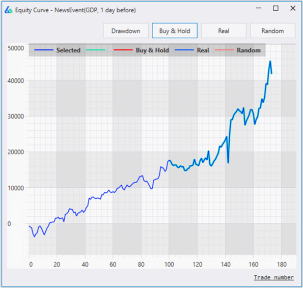 This first strategy goes long S&P500 futures emini contract one day before a GDP announcement and sells the next open or the day of the GDP report. This strategy should not be considered a standalone edge but does provide an interesting starting point for those interested in finding anomalies around News Events.