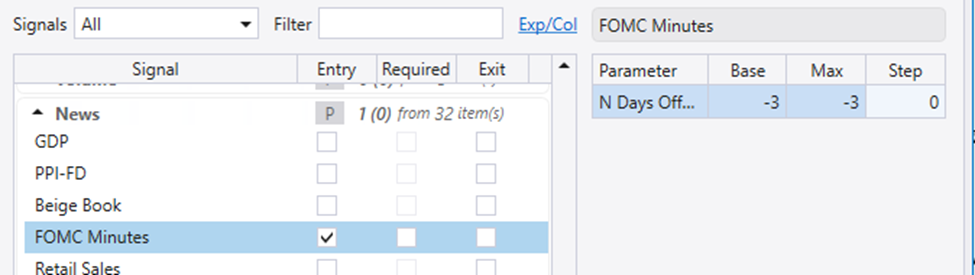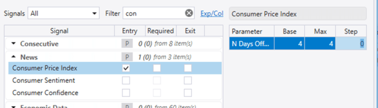 Click on any news event and set a positive value to test how many days after a news event to trigger a signal.